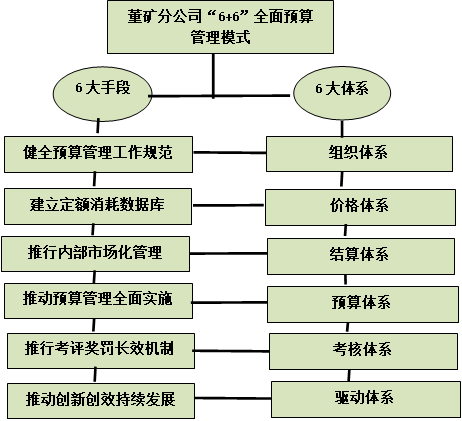 董礦分公司作為一對(duì)生產(chǎn)了30多年的老礦井,服務(wù)年限長(zhǎng)、地質(zhì)災(zāi)害嚴(yán)重、成本居高不下,受“煤炭寒冬”影響,和眾多煤企一樣,出現(xiàn)大幅虧損,一度瀕臨關(guān)閉,在這種艱難形勢(shì)下,對(duì)董礦人來(lái)說(shuō),實(shí)施全面預(yù)算管理不僅僅是一種管理手段,更是全面實(shí)現(xiàn)“保安全、保穩(wěn)定、保生存、保礦井”目標(biāo)的迫切需要。逆流而上,順勢(shì)而為,董礦分公司通過(guò)召開專題研討會(huì)、黨政聯(lián)席會(huì)、思想大討論和對(duì)標(biāo)管理學(xué)習(xí),進(jìn)行全礦動(dòng)員,統(tǒng)一思想,開闊思路,提升境界,確立了以治虧創(chuàng)效、激活潛能為主線,管理主體全員化、預(yù)算編制科學(xué)化、運(yùn)行機(jī)制市場(chǎng)化、過(guò)程控制動(dòng)態(tài)化、結(jié)算手段程序化、考核激勵(lì)規(guī)范化的工作方略,探索形成了以健全預(yù)算管理工作規(guī)范、建立定額消耗數(shù)據(jù)庫(kù)、推行內(nèi)部市場(chǎng)化管理、推動(dòng)預(yù)算管理全面實(shí)施、推行考評(píng)獎(jiǎng)罰長(zhǎng)效機(jī)制、推動(dòng)創(chuàng)新創(chuàng)效持續(xù)發(fā)展6大手段和以構(gòu)建組織體系、價(jià)格體系、結(jié)算體系、預(yù)算體系、考核體系、驅(qū)動(dòng)體系6大體系為主要內(nèi)容的“6+6”全面預(yù)算管理創(chuàng)建模式。