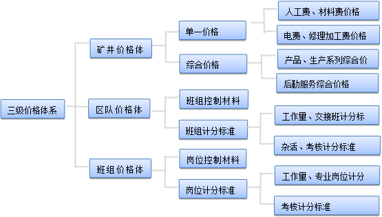 構(gòu)建三級(jí)價(jià)格體系。一級(jí)價(jià)格體系為礦井層面價(jià)格體系。包括單一價(jià)格和綜合價(jià)格,其中單一價(jià)格包括人工費(fèi)價(jià)格、材料費(fèi)價(jià)格、電費(fèi)價(jià)格、修理加工費(fèi)價(jià)格,綜合價(jià)格包括產(chǎn)品系列綜合價(jià)格、生產(chǎn)系列綜合價(jià)格、后勤服務(wù)系列綜合價(jià)格。二級(jí)價(jià)格體系為區(qū)隊(duì)層面價(jià)格體系。包括班組計(jì)分標(biāo)準(zhǔn)、班組控制材料價(jià)格,其中班組計(jì)分標(biāo)準(zhǔn)包括工作量計(jì)分標(biāo)準(zhǔn)、交接班計(jì)分標(biāo)準(zhǔn)、雜活計(jì)分標(biāo)準(zhǔn)、考核計(jì)分標(biāo)準(zhǔn)。三級(jí)價(jià)格體系為班組層面價(jià)格體系。包括崗位計(jì)分標(biāo)準(zhǔn)、崗位控制材料費(fèi)價(jià)格,其中崗位計(jì)分標(biāo)準(zhǔn)包括工作量計(jì)分標(biāo)準(zhǔn)、專業(yè)崗位計(jì)分標(biāo)準(zhǔn)、考核計(jì)分標(biāo)準(zhǔn)。