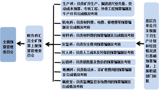 構(gòu)建預(yù)算體系。預(yù)算主要內(nèi)容包括生產(chǎn)預(yù)算、成本與費(fèi)用預(yù)算、勞資預(yù)算、資金預(yù)算等,分別由業(yè)務(wù)歸口部門具體負(fù)責(zé)。其中,生產(chǎn)預(yù)算包括原煤產(chǎn)量、掘進(jìn)進(jìn)尺等;成本與費(fèi)用預(yù)算包括工資、材料、電力、修理費(fèi)、其他支出、賠償費(fèi)及專項(xiàng)費(fèi)用等;勞資預(yù)算就是職工人數(shù)及工資總額的預(yù)算;資金預(yù)算主要包括與業(yè)務(wù)預(yù)算和資本預(yù)算相關(guān)聯(lián)的日常資金收支預(yù)算和籌資預(yù)算。同時(shí),公司還進(jìn)一步規(guī)范了預(yù)算審批程序。以生產(chǎn)計(jì)劃和成本控制相結(jié)合為預(yù)算編制起點(diǎn),各單位每月末根據(jù)下月生產(chǎn)計(jì)劃和經(jīng)營(yíng)情況進(jìn)行基礎(chǔ)預(yù)算編制,上報(bào)至相關(guān)職能部門審批。各預(yù)算職能部門根據(jù)基層預(yù)算匯總后報(bào)財(cái)務(wù)科審批,財(cái)務(wù)科匯總?cè)V預(yù)算并上報(bào)預(yù)算管理委員會(huì),經(jīng)審批后,形成最終預(yù)算。