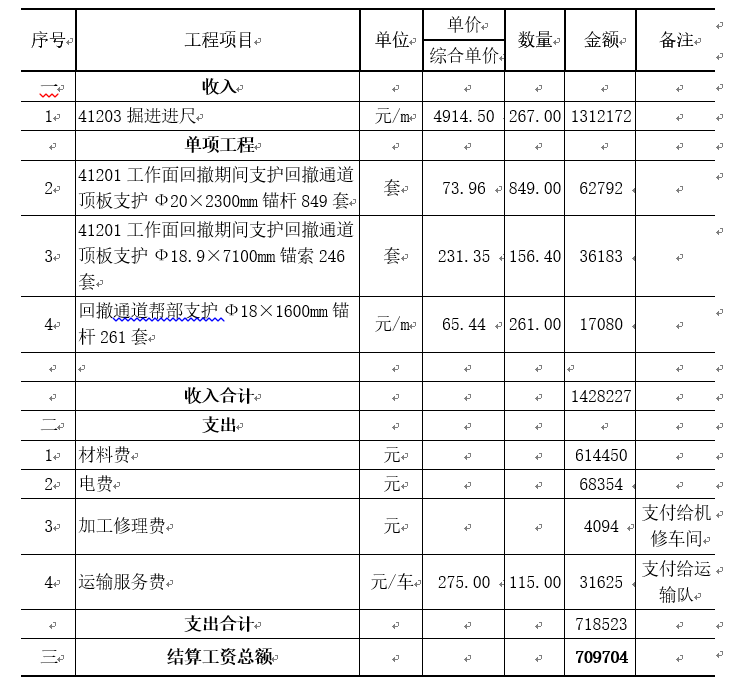綜掘一隊在掘巷道41205工作面回風順槽,掘進斷面18.9m2,巷道煤巖類型全煤,全面預算管理辦公室測算延米綜合價格4014.5元/m,4月份計劃進尺200m,實際完成267m,完成計劃任務的133.5%,另在41201工作面回撤期間對回撤通道頂板支護Ф20×2300mm錨桿849套(每套定價73.96元)、Ф18.9×7100mm錨索246套(每套定價231.35元)、幫部支護Ф18×1600mm錨桿261套(每套定價65.44元)等零星單項工程。按照內部市場化一級結算流程結算如下: