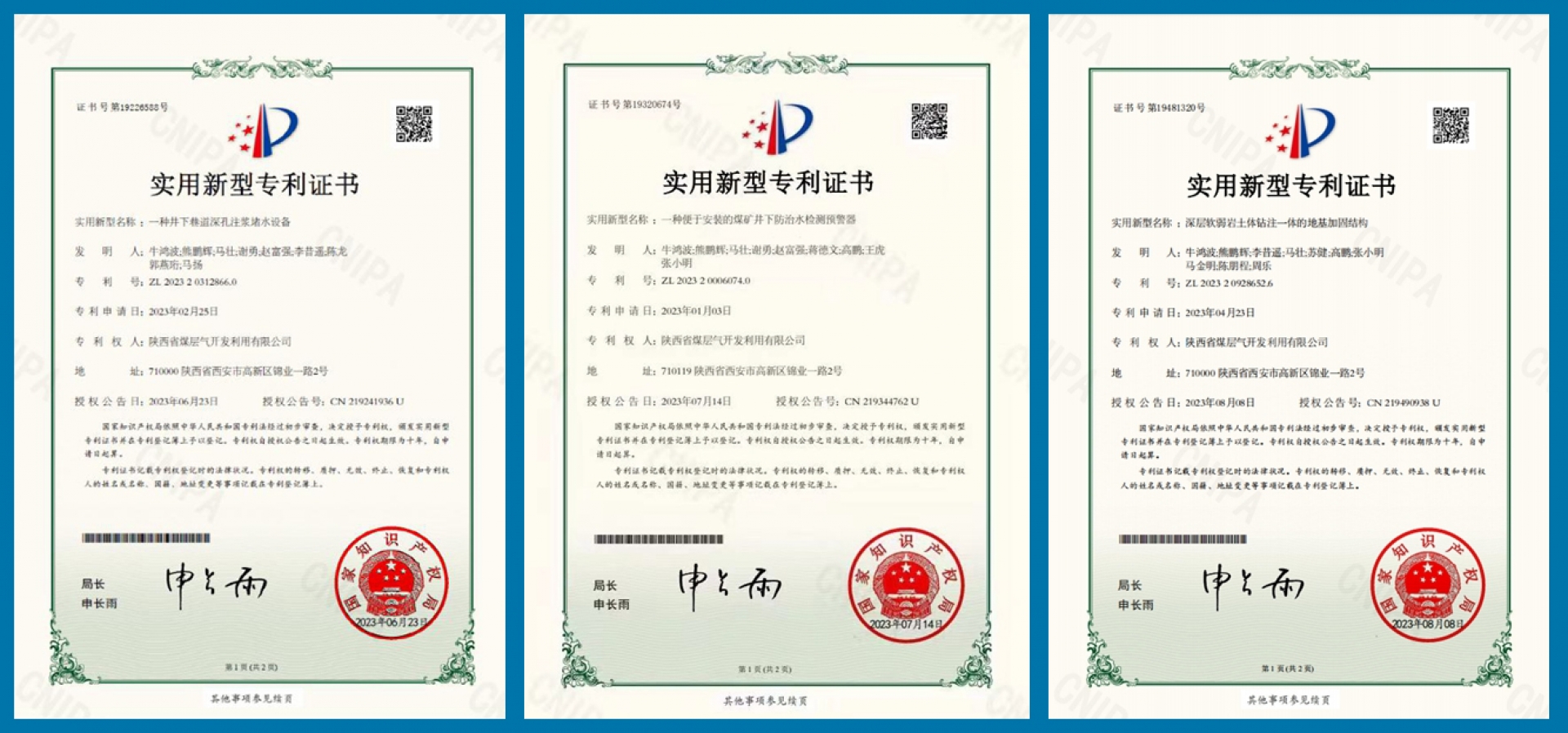陜煤層氣韓城分公司三項科技成果又獲得國家知識產(chǎn)權(quán)局授權(quán)近日,陜煤層氣韓城分公司“一種井下巷道深孔注漿堵水設(shè)備”“一種便于安裝的煤礦井下防治水檢測預警器”“深層軟弱巖土體鉆注一體的地基加固結(jié)構(gòu)”三項實用新型專利又獲國... 2023-11-13