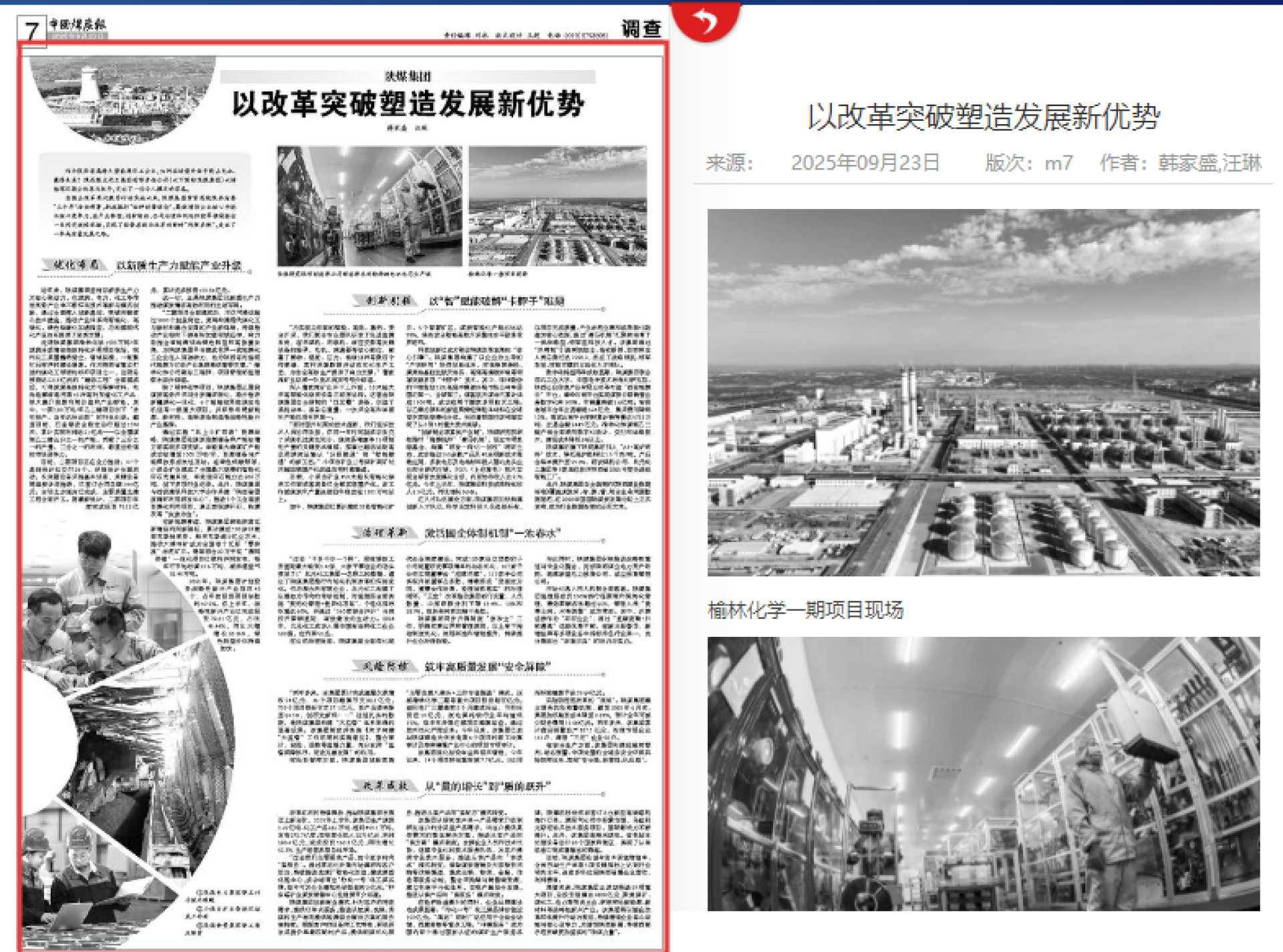 中國煤炭報 2025年9月23日7版 陜煤集團以改革突破塑造發展新優勢作為陜西省屬特大型能源化工企業,如何在轉型升級中搶占先機、贏得未來?...
