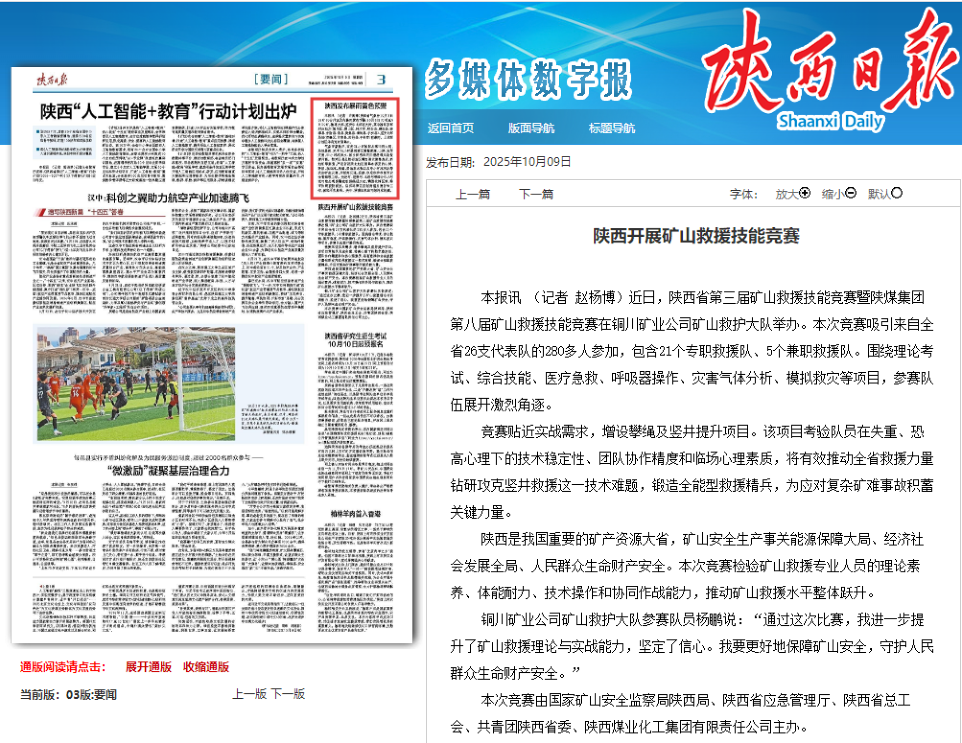 陜西日報10月9日3版陜西開展礦山救援技能競賽本報訊 (記者 趙楊博)近日,陜西省第三屆礦山救援技能競賽暨陜煤集團第八屆礦山救援技能競賽在銅川礦業公司礦山救護大...