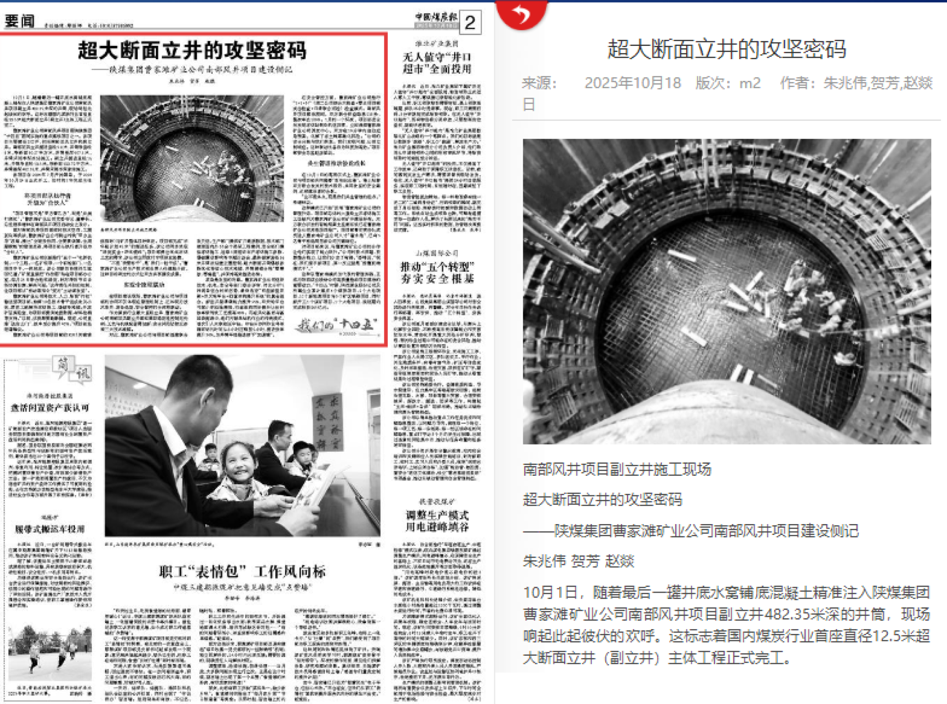 中國煤炭報 | 超大斷面立井的攻堅密碼——陜煤集團曹家灘礦業公司南部風井項目建設側記