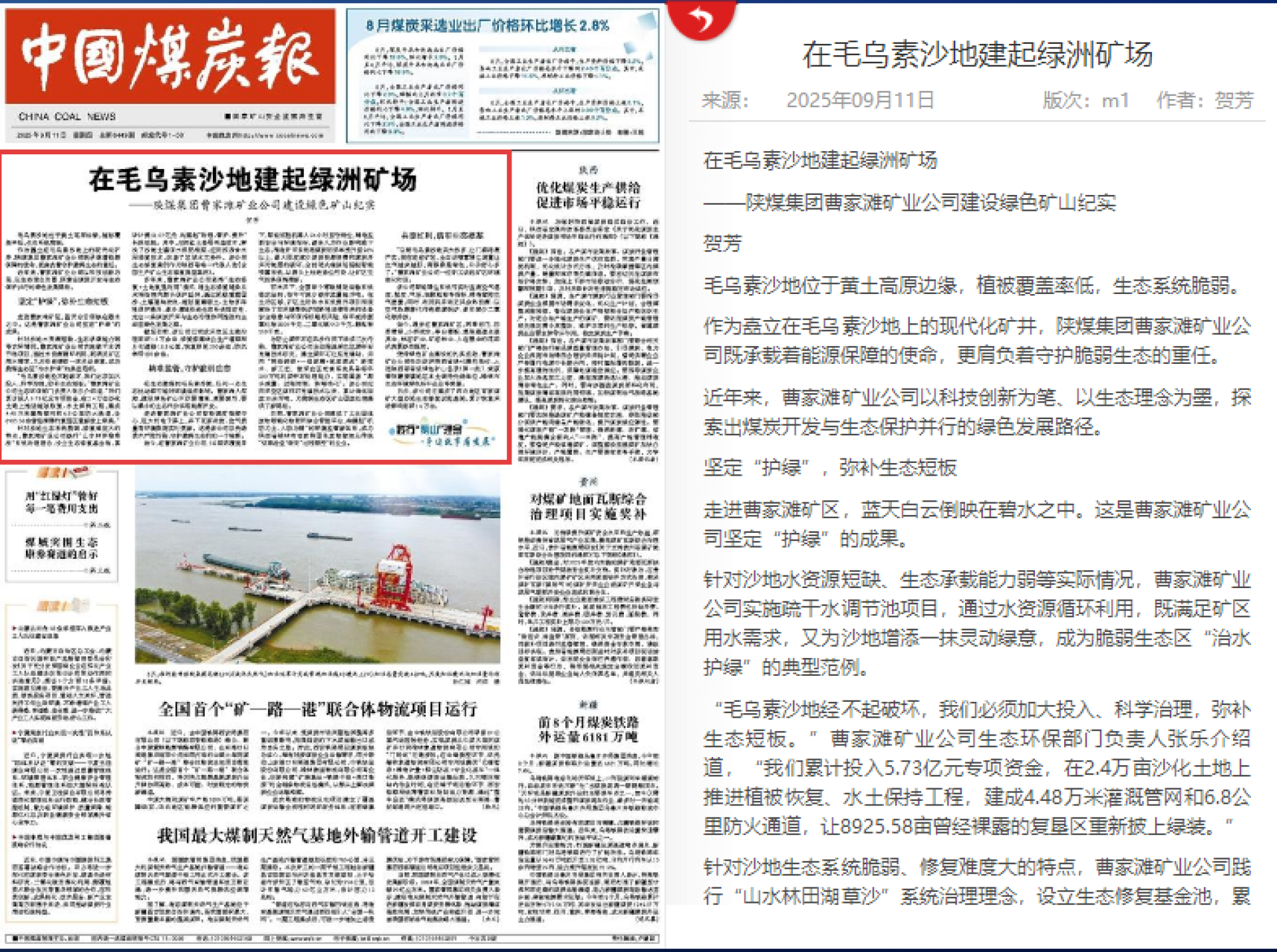 中國煤炭報 | 在毛烏素沙地建起綠洲礦場——陜煤集團曹家灘礦業公司建設綠色礦山紀實